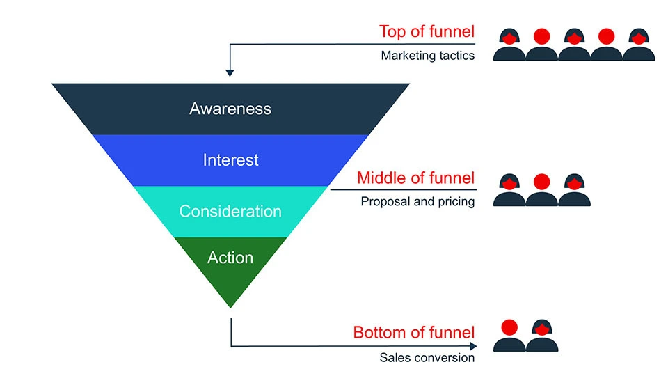 An inverted triangle represents the sales funnel. At the top of the funnel, which is the widest part, businesses use marketing tactics to generate awareness among many people. Further down is the middle of the funnel, which includes the interest and consideration stages. Businesses present prospects with proposals and pricing to move as many of them as possible through these stages of the funnel. At the bottom of the funnel, a few people decide to take action, resulting in sales conversion for the business.